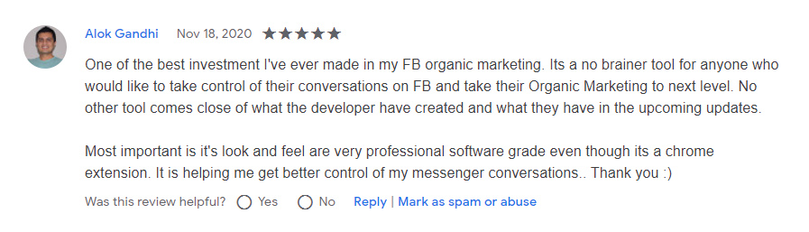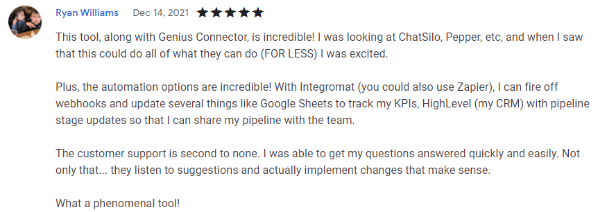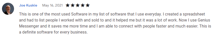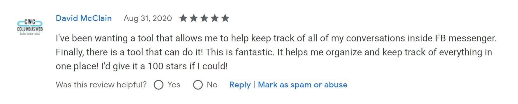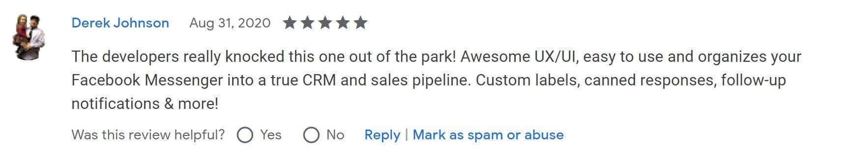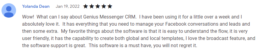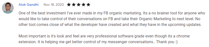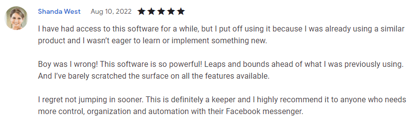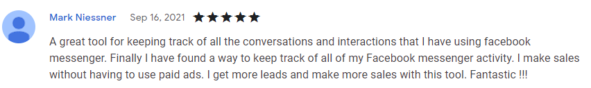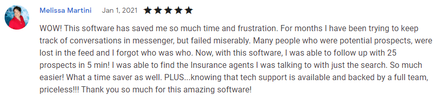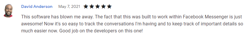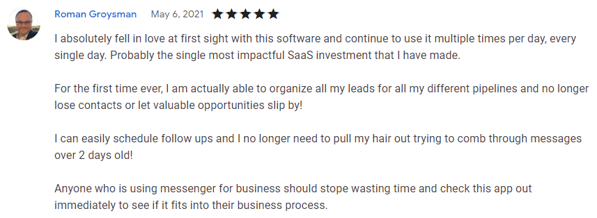 "I would give this 10 STARS if possible. Not only does this app work exactly as advertised, it changed my follow up with messenger contacts immediately - it's easy to use - the support is absolutely second to none! Bravo! Definitely worth it."